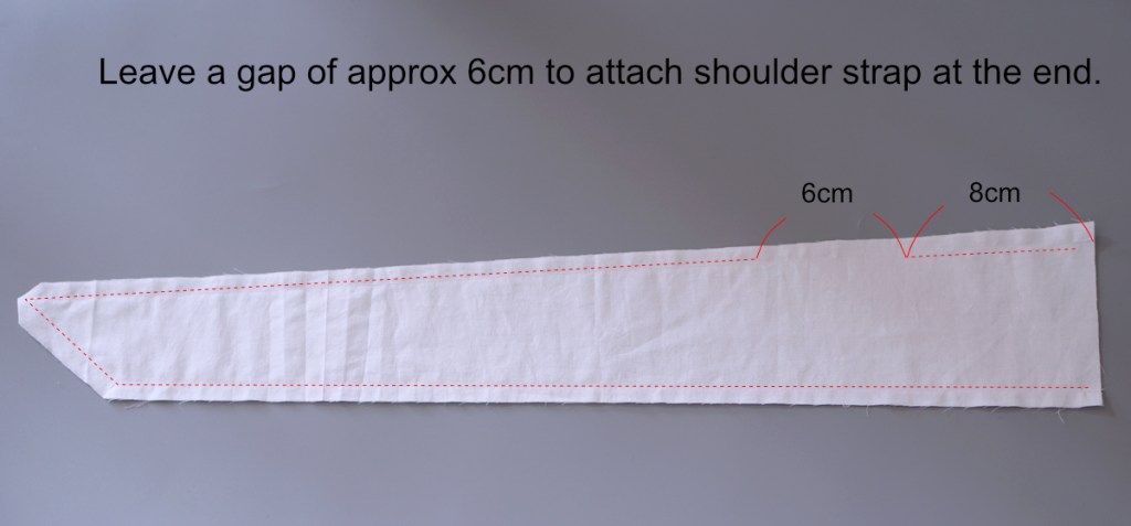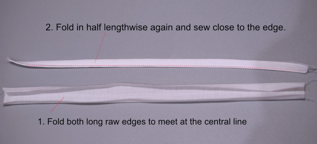 Cut two pieces of rectangles measuring 3.2cm in width and 30cm in length from the main fabric. Fold the long edges of one piece toward the long centre line, and fold again along the long centre line to form the strap. Sew close along the long edge. Iron flat and repeat with the other piece.
