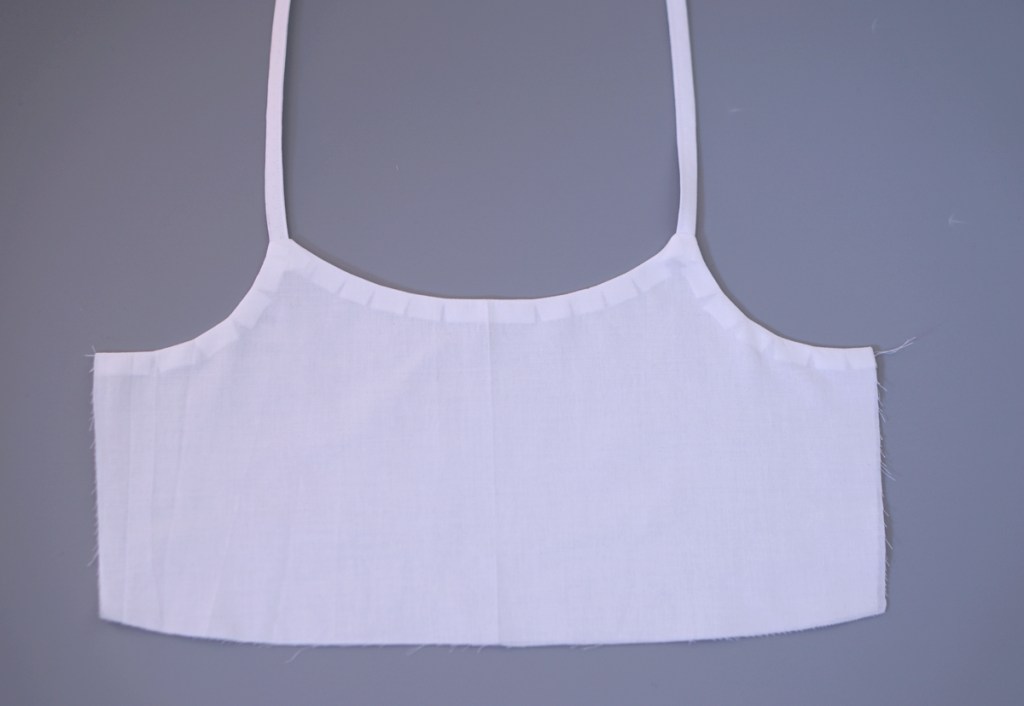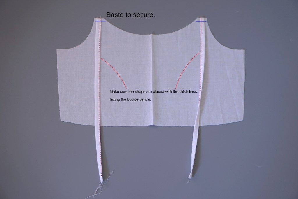 2. Attaching should straps. Place the shoulder straps to the centre of the top corners of the bodice main fabric (with the right side of the bodice facing up), making sure that they mirror each other. Baste with 0.8cm seam allowance to secure them in place.