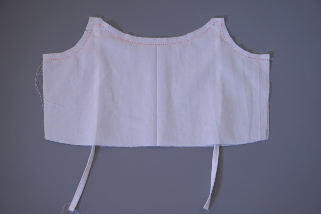 Place the bodice lining on top of the bodice main with the right sides touching and the raw edges lining up. Pin and sew along the armhole and necklines. Clip the seam allowance close to the stitch line all along. Turn it to the right side and iron flat.
