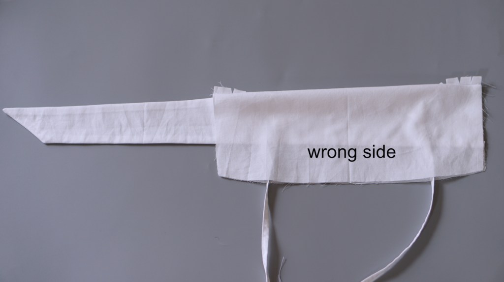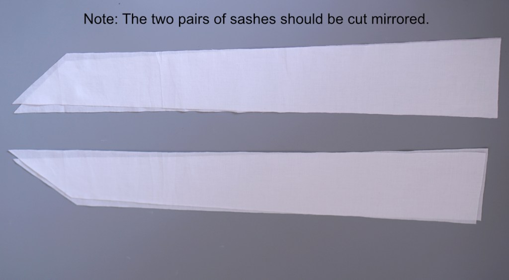 Place one pair of the sashes with the right sides touching. Pin and sew along the edges as shown in the picture, leaving a 6cm’s gap around 8cm from the raw open edge on the longest edge. Turn to the right side and iron flat. Repeat with the other pair.