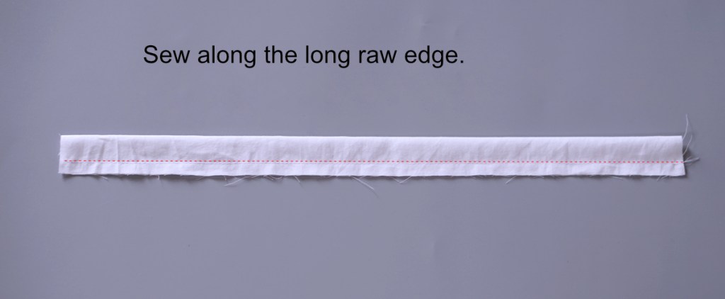 Fold the elastic casing piece lengthwise with the wrong sides touching and the raw edges lining up. Sew along the long raw edge.