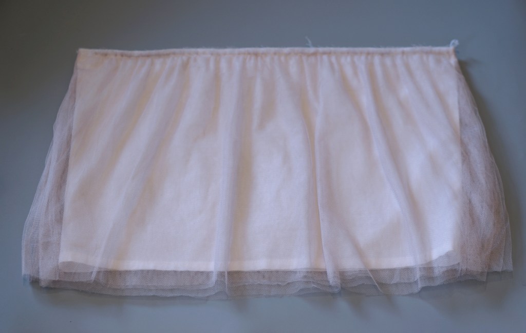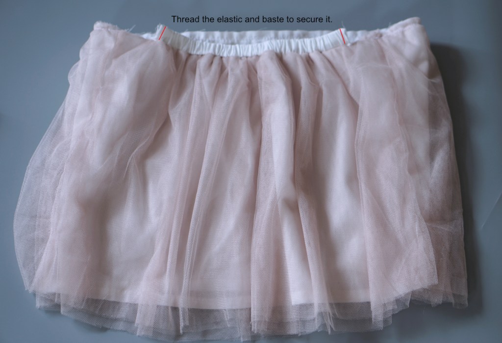 (Optional: for extra tulle layers, cut the tulle fabric with the same measurement as the skirt piece and repeat the same steps above except the hemming – there is no need to hem the tulle. Then baste it along the waist to the skirt main fabric.)