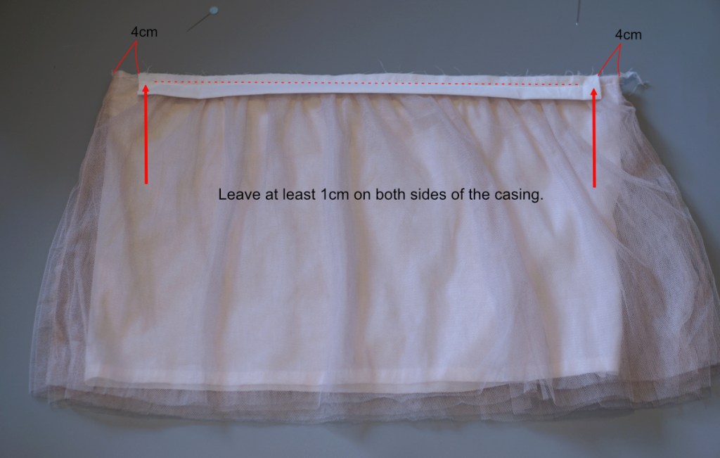 On the back of the skirt (right side up), measure 4cm on both sides, mark with pins, and place the elastic casing between the marks along the waist line with the raw edges lining up. Pin and sew the casing to the skirt. (Note: do not sew into the 1cm seam allowance on both side of the casing.)