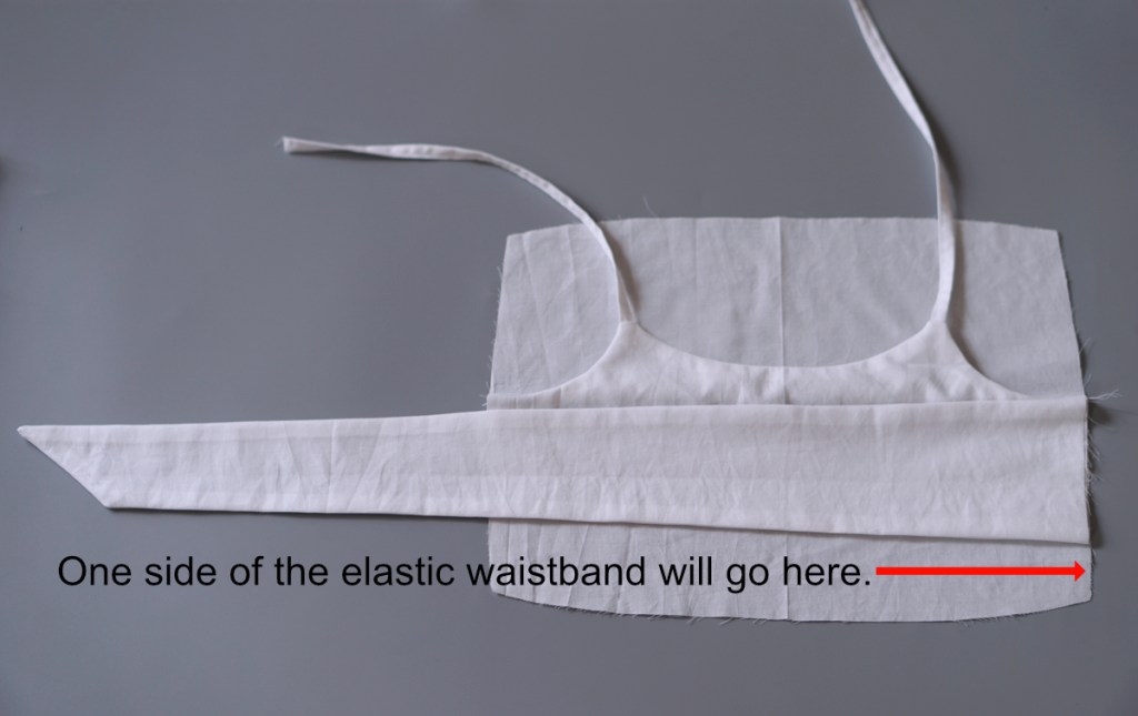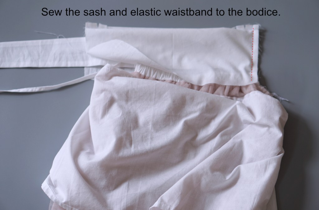 Now sandwich one end of the elastic waistband right below the sash. Pin and sew it in place between the bodice main and lining.