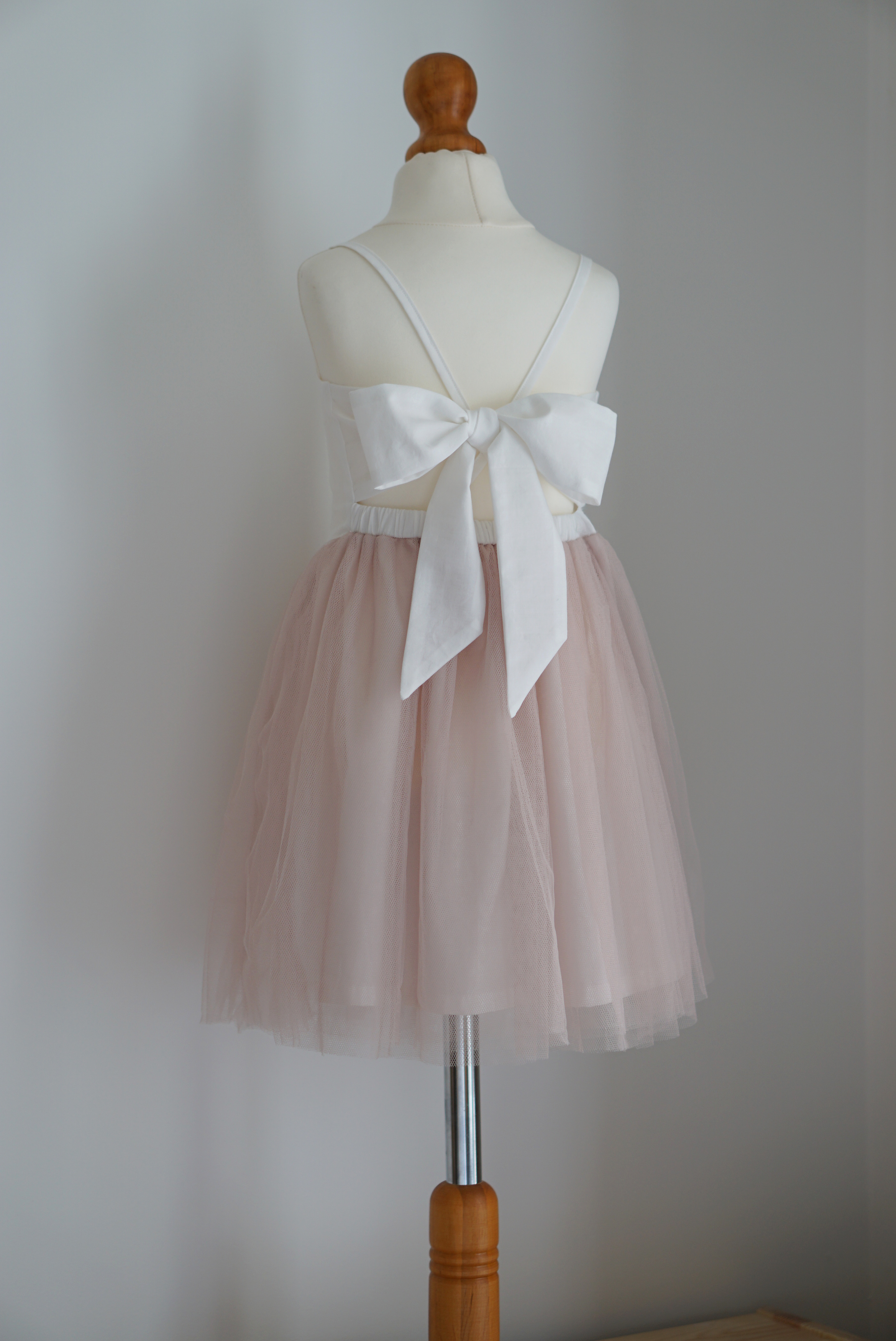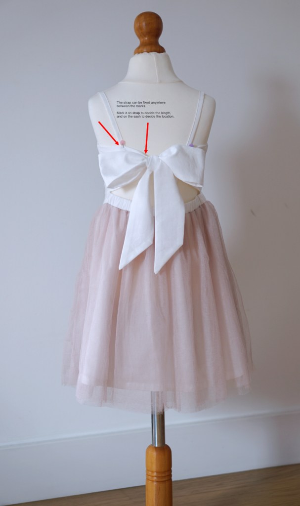 Put the dress on the girl or mannequin to decide the length and position of the shoulder strap. Mark the suitable length on the strap and the position on the sash, and trim off the excessive length of the strap. (You only need to do one side, take the measurement and copy the marks to the other side.)