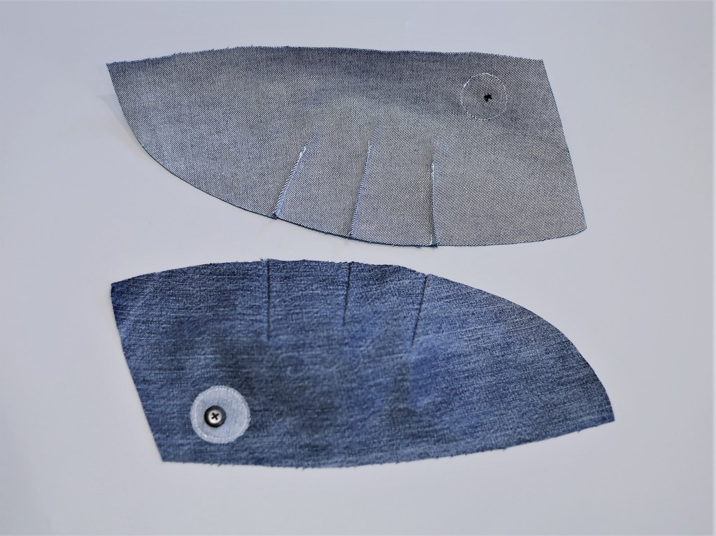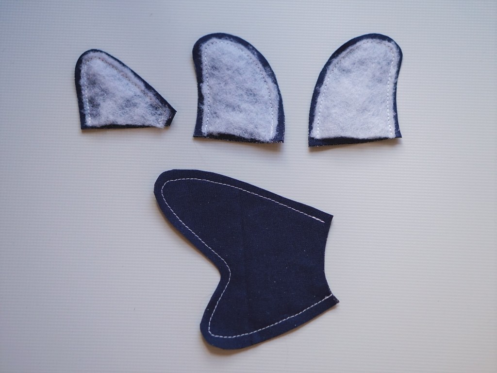 a. Sew the darts on the back pieces (D) and iron them towards the tail. Place the two back pieces (D) together with the right sides touching and the pectoral fin (B) sandwiched in between – the pectoral fin should start from the marked point for “fin” on the pattern.