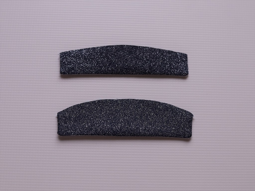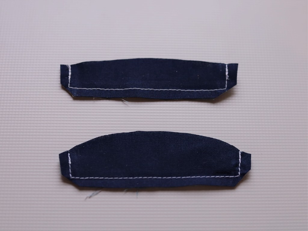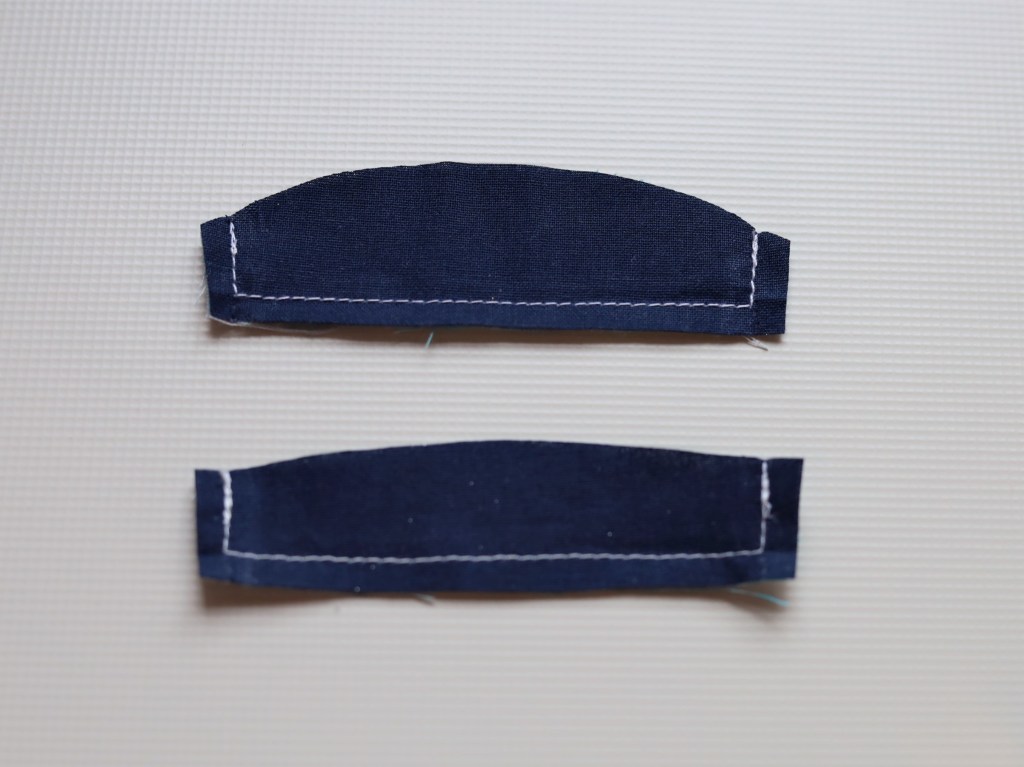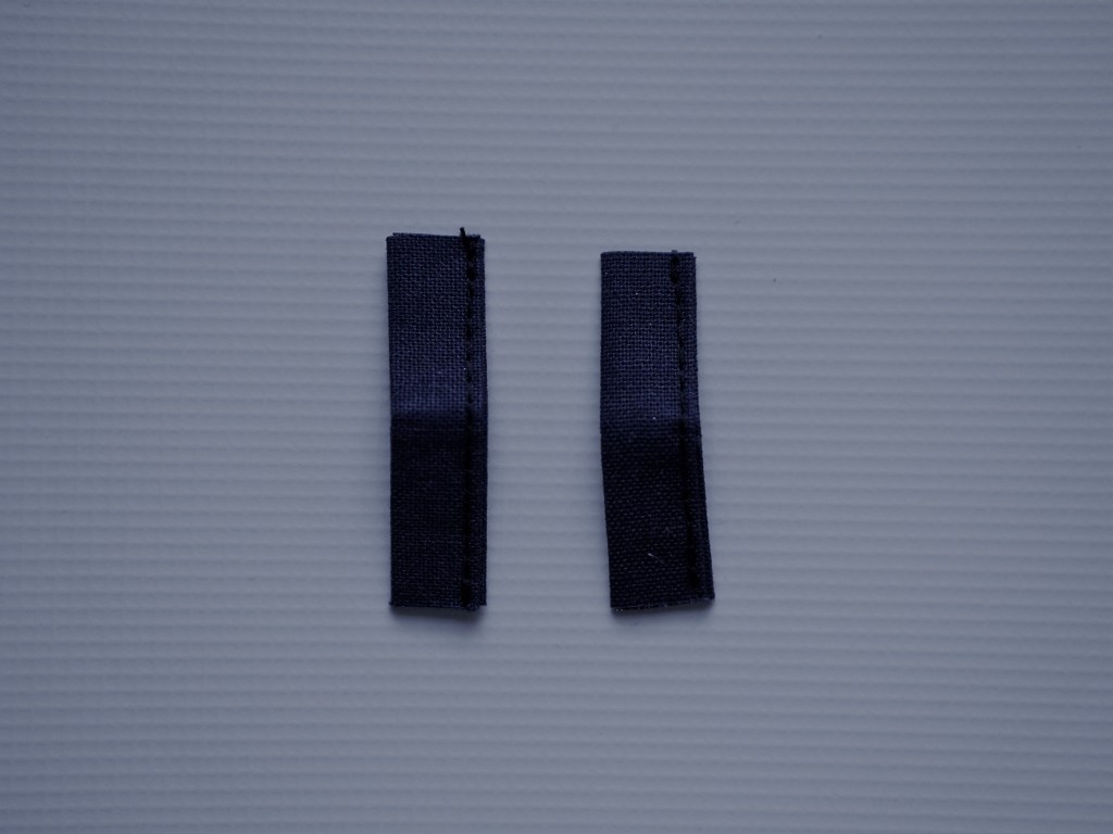 Place the two upper zip pieces (K) (main and lining) together with the right sides touching and raw edges lining up. Fold in the long straight edge by the seam allowance (e.g. 1cm for mummy shark) to one side (it doesn’t matter to which side). Sew along the two short edges. Turn to the right side – now it should be easy to fold in the long straight edges by the seam allowance. Iron flat. Repeat with the lower zip pieces (L).
