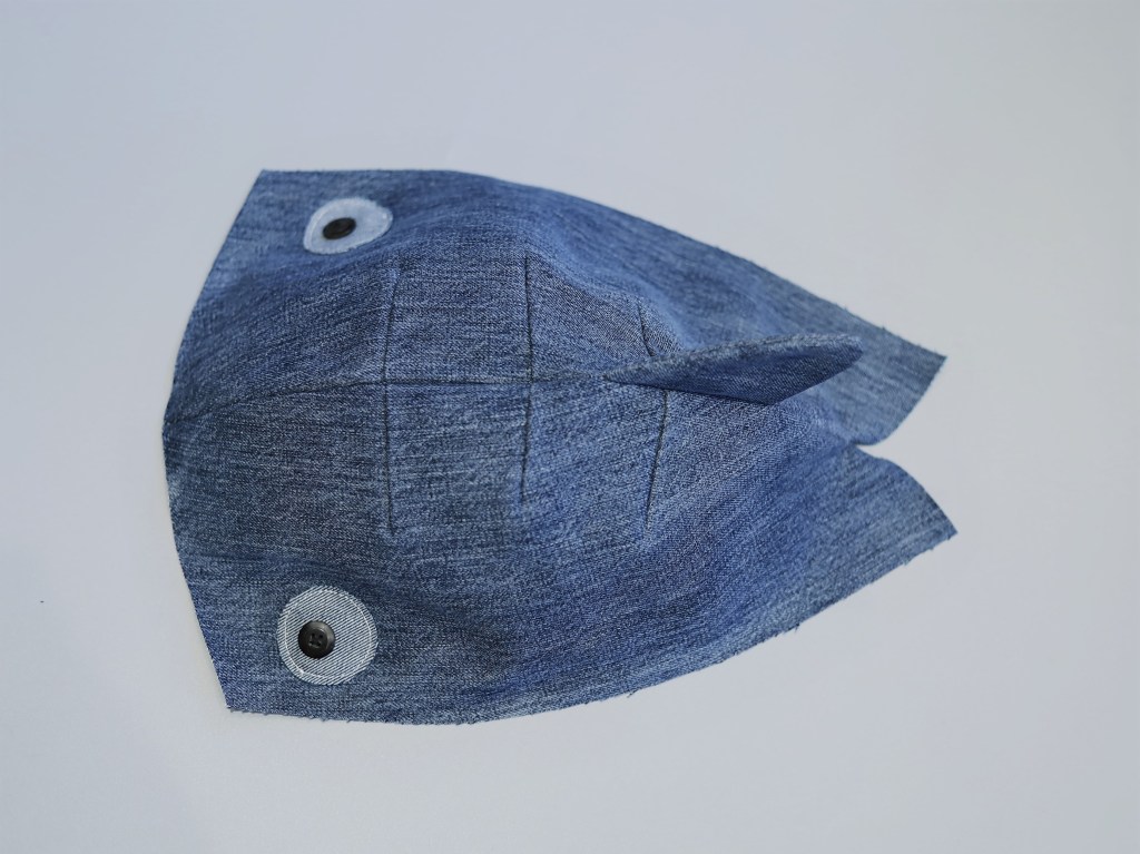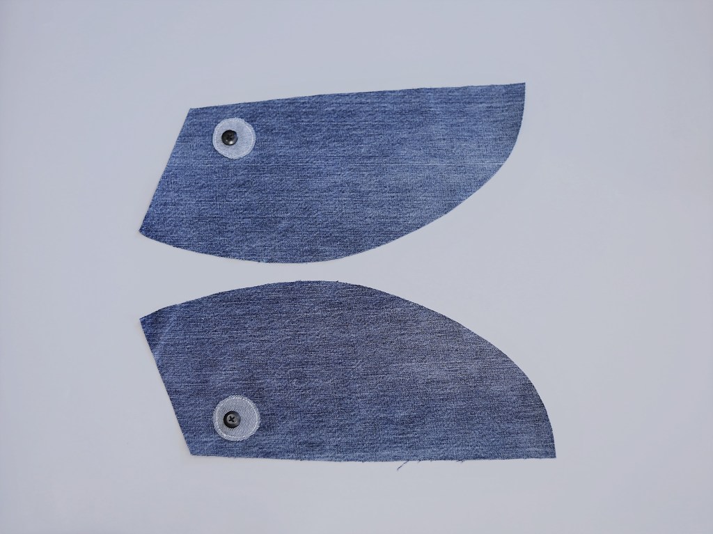 b. eyes: Cut two circles (see Back (D) pattern piece) from the fabric you choose for the eyes. For large size mummy shark, I use the wrong side of the denim fabric for eyes. For small bag baby shark I simply used buttons. I also add buttons for mummy shark’s eyes but it is optional. Pin the circles to the right side of the back pieces (D) according to the pattern, and sew slowly around using 0.1cm seam allowance. Sew the buttons on by hand.