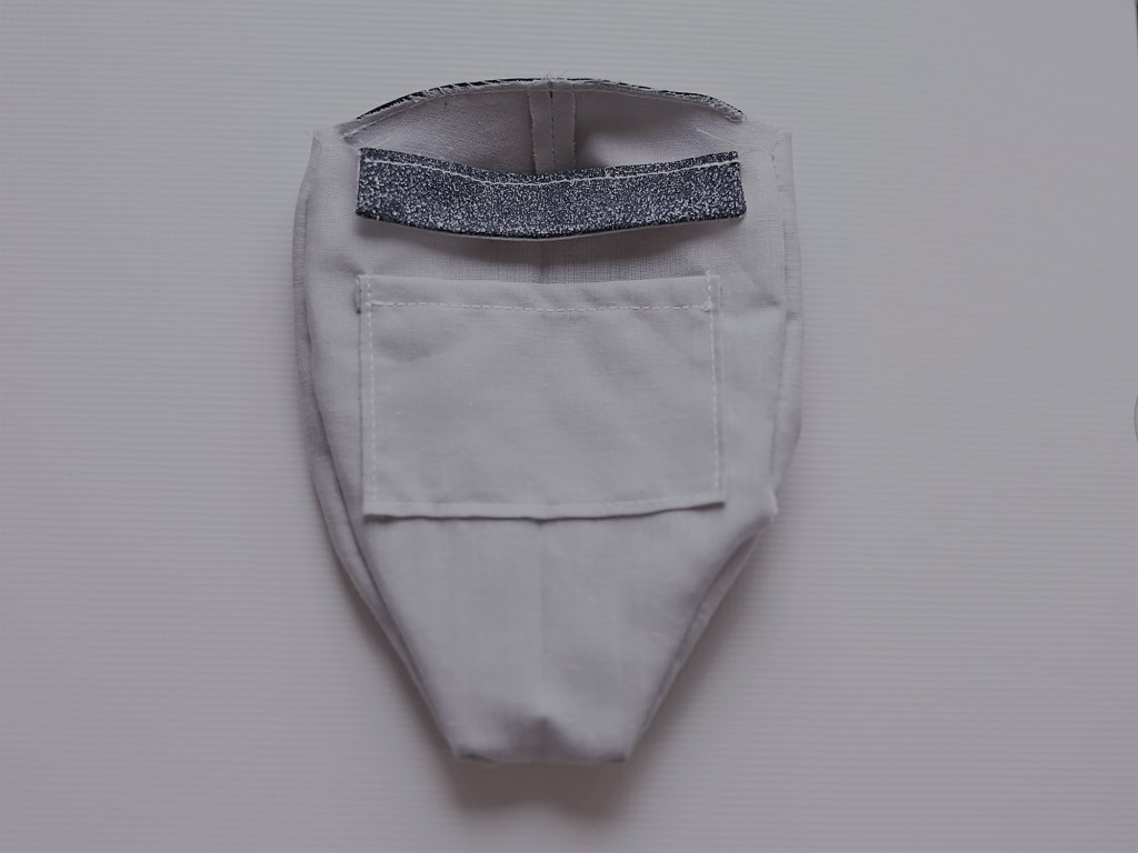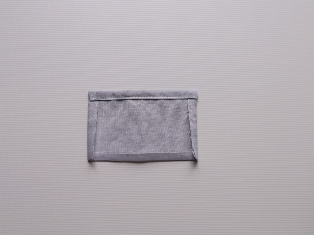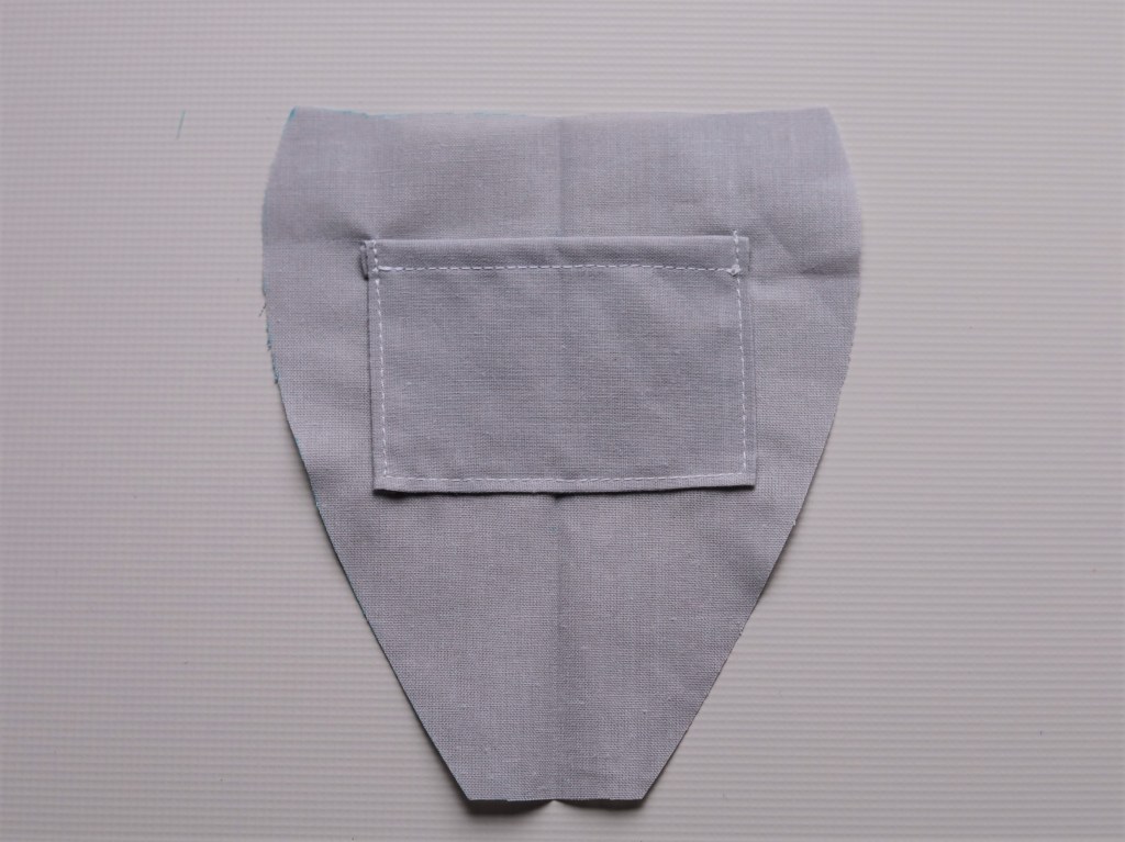 b. Make the inner pocket (optional): Fold both sides and the bottom edges of the pocket piece (I) to the wrong side by the seam allowance (i.e. 1cm for mummy shark) once and iron flat. Fold down the top edge twice to the wrong side by the seam allowance. Sew along using 0.1cm seam allowance. Attach the pocket piece (I) to the belly lining(J) as indicated on the pattern, with the wrong side of the pocket (I) touching the right side of the belly lining (J). Sew along both sides and the bottom of the pocket using 0.1cm seam allowance.