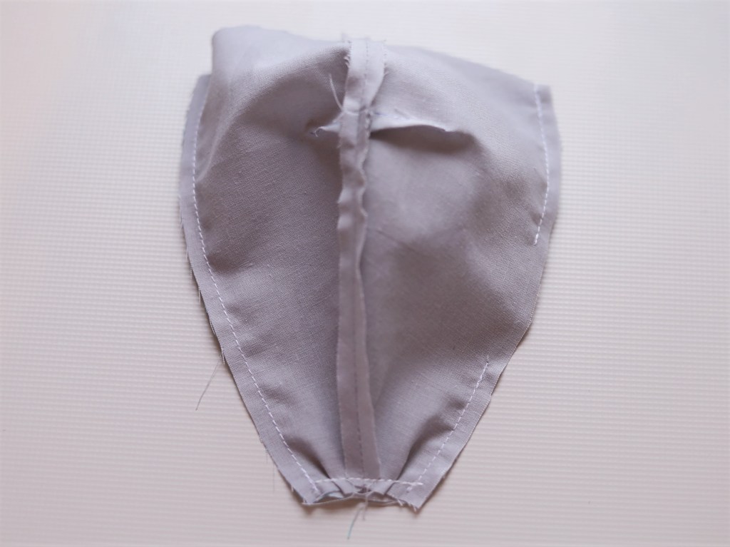 a. Place the upper lip piece (F) and lower lip (G) together with the right sides touching and the short sides lining up. The longest side of (F) should be with the longest side of (G). Sew along the two short sides. Iron the seams open.