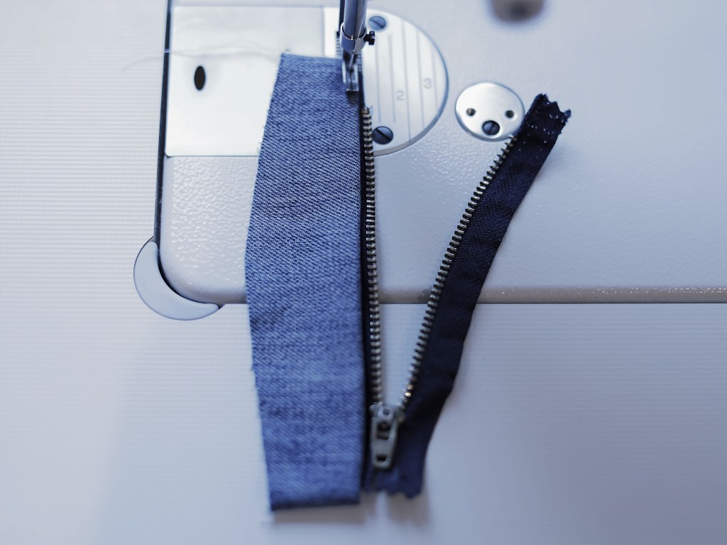 With the right sides facing up, sandwich one side of the zip in between the main and lining piece of upper zip (K), aligning the middle of the zip with the middle of the long straight side of upper zip piece (K). Change to the zipper foot and sew closely along the edge.