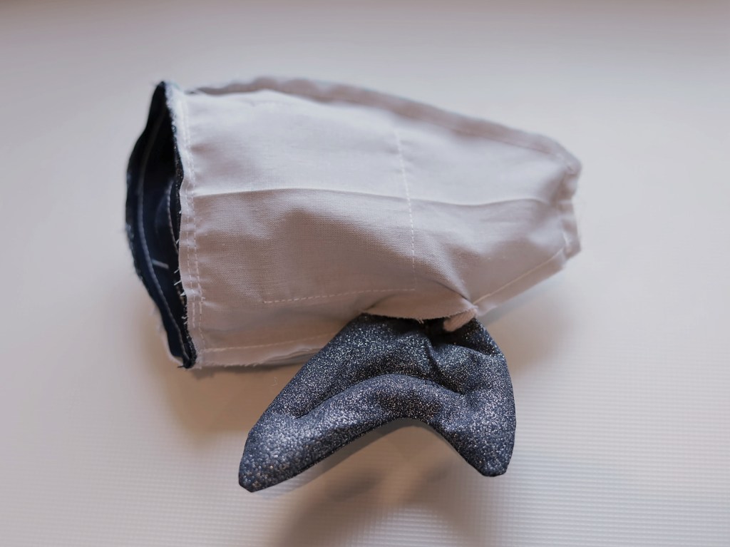 b. Turn the fins and tail to the right side with the help of a pointy stick and iron flat. Stuff the tail (C) with a small amount of polyester filling. Put a little at a time and spread them evenly. Don’t put too much fillings as it would make it difficult to sew the curve in the middle. We only need enough to hold the shape of the tail. Sew the curve in the middle of the tail. Sew along the opening with half seam allowance (e.g. 0.5cm for the large size).