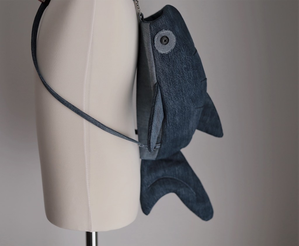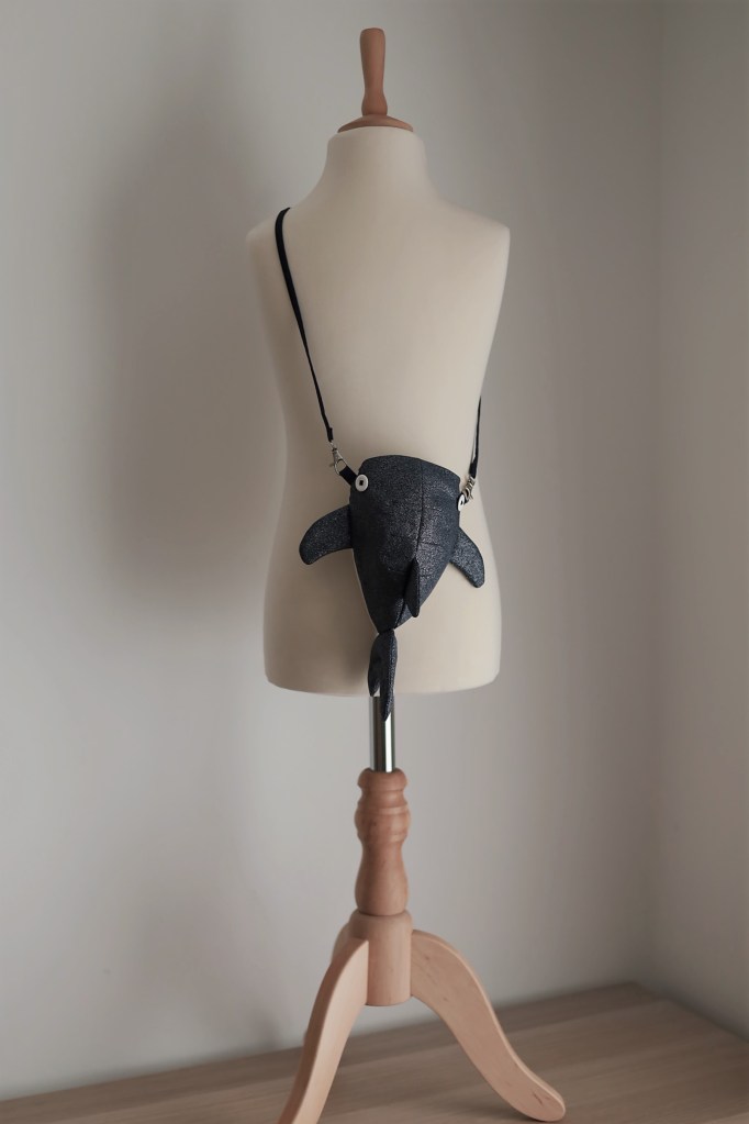Follow the same method in step 2a to create the strap(s). Thread the end through the lobster clasp, fold over and sew across to fix it. Attach the lobster clasps as desired. Congratulations – you have now created your shark bag!